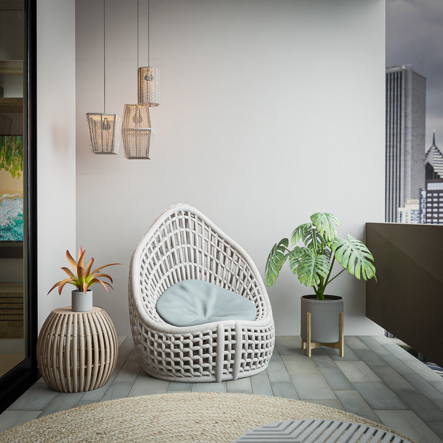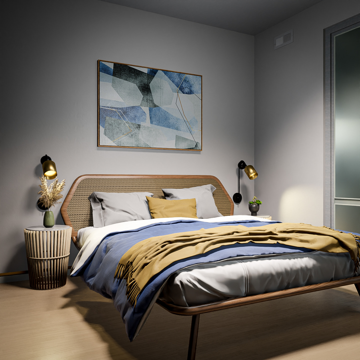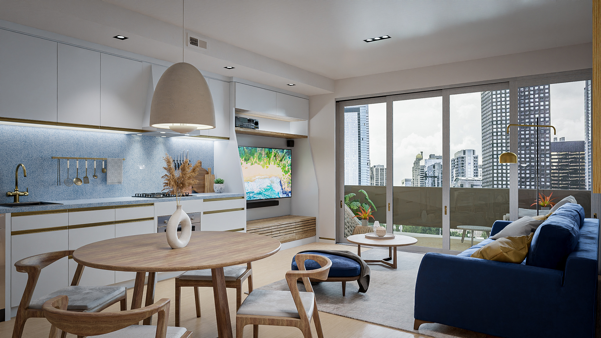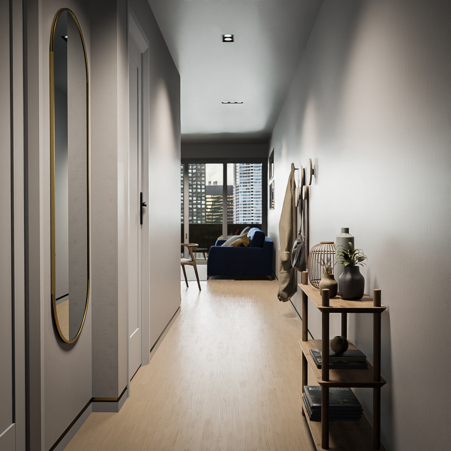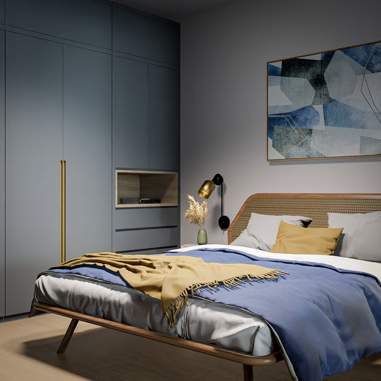 Concepto de apartamento con detalles en tonos oro y acentos azules. - Por Gaxiol3Design -