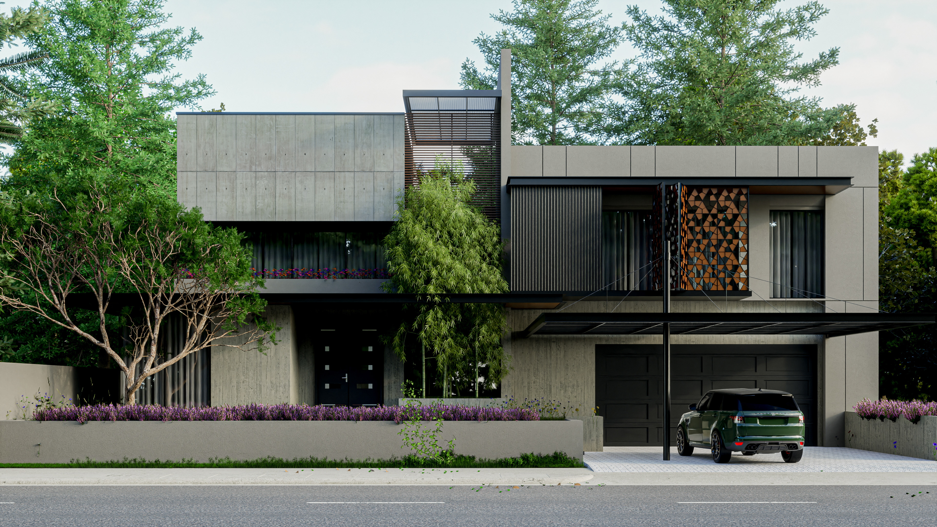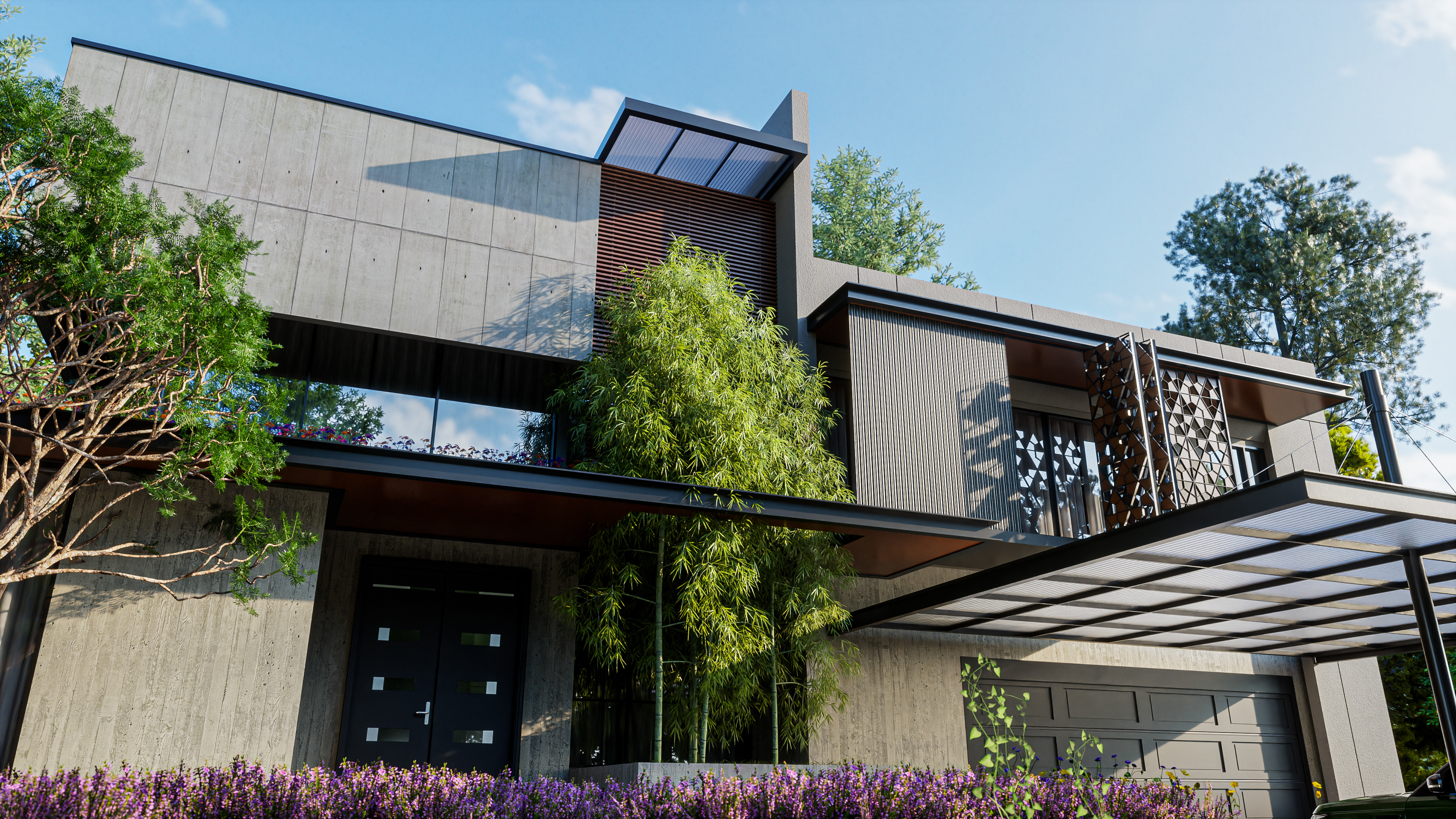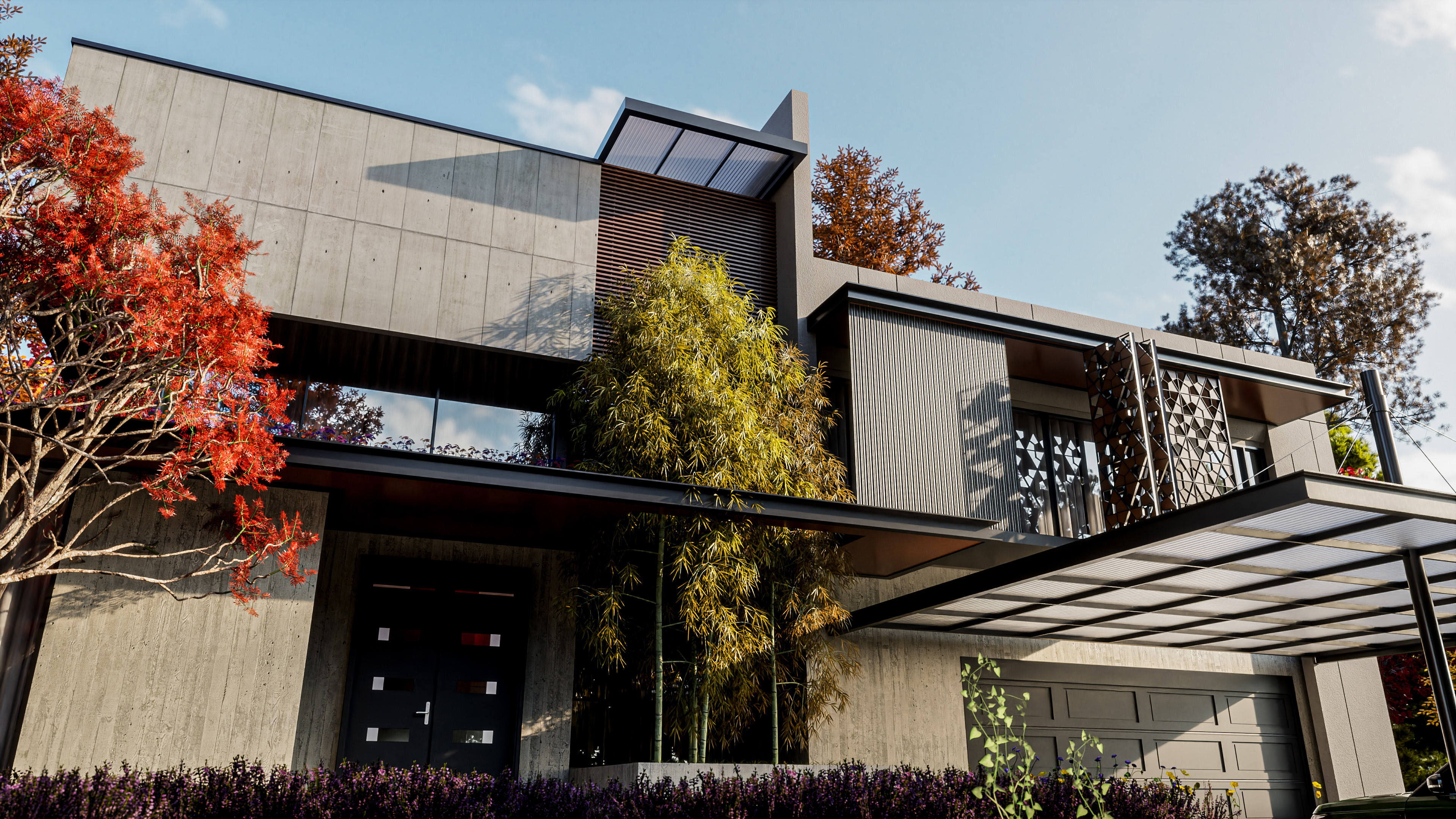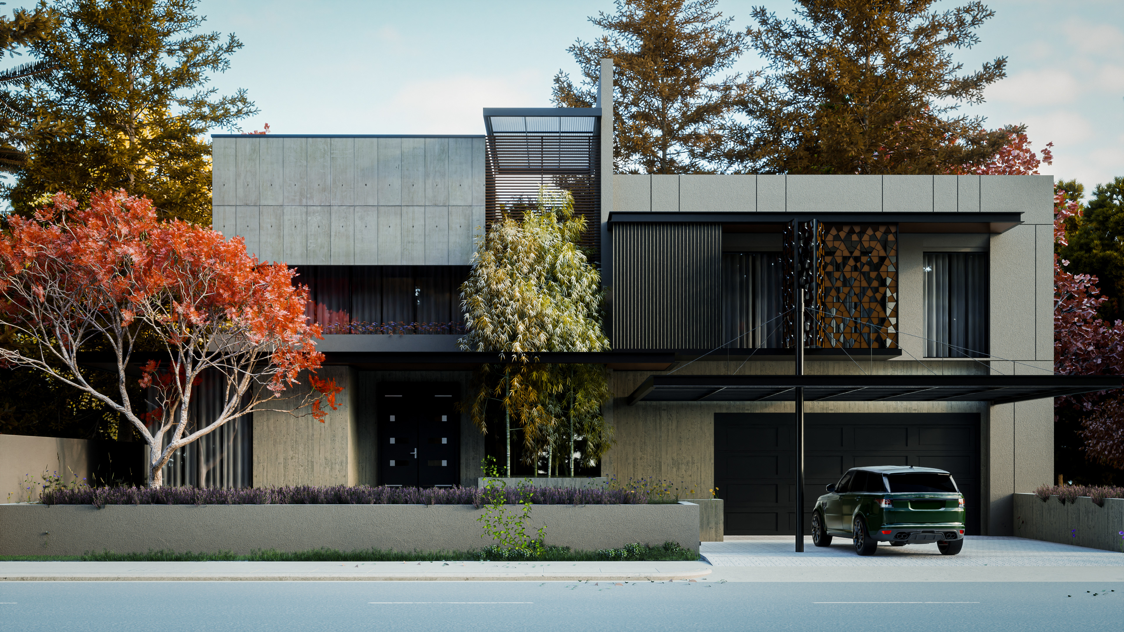 Diseño de una casa de concreto en diferentes acabados, presentado en dos estaciones: Primavera y Otoño,
